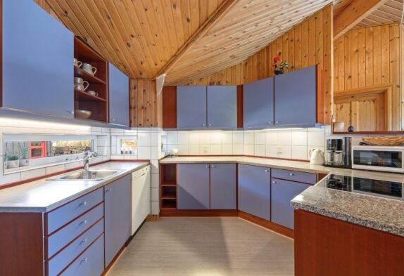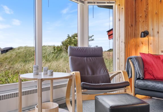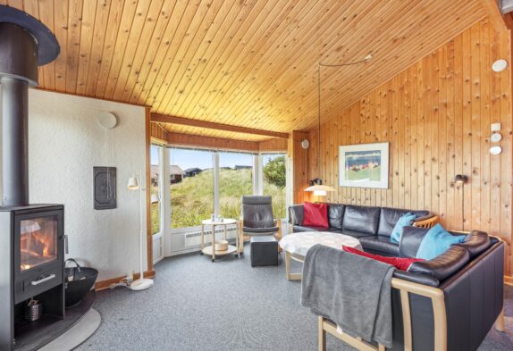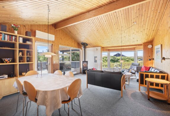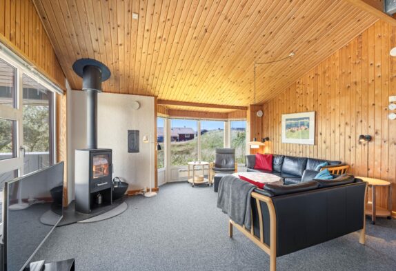 Sommerhusets samlingssted er alrummet, der, med store vinduespartier, rustik træbeklædning til kip og hyggelige møbler, indbyder til afslapning for hele familien. Fjernsynet med Chromecast og et Bluetooth-højttalersystem sørger for underholdning for både store og små, mens brændeovnen og den energibesparende luft-til-luft varmepumpe giver behagelig varme på køligere aftener.