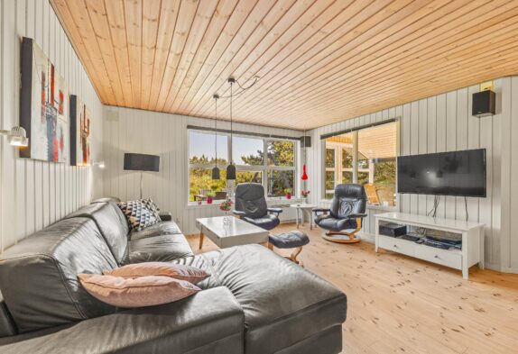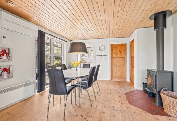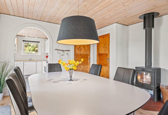 Stuen er udstyret med en hyggelig brændeovn, der skaber den perfekte atmosfære for de køligere aftener. Sommerhuset har desuden en luft til luft varmepumpe, der sikrer et behageligt indeklima hele året rundt. Chromecast som er indbygget i TV er også tilgængeligt, så I kan streame jeres yndlingsserier og -film direkte på sommerhusets tv.