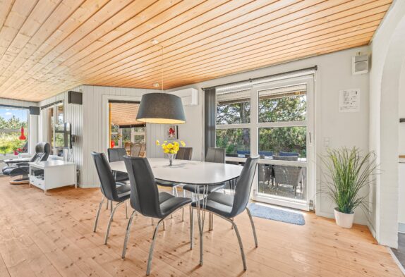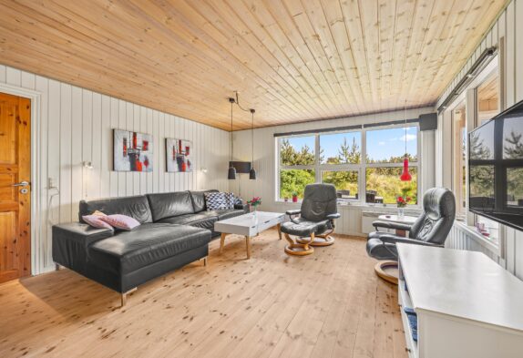 Udenfor venter en skøn udestue, hvor I kan nyde udsigten ud til den enestående natur – Henne Strands klitter. Udestuen er den oplagte plads til både ro og hygge uanset vejret. De store vinduer sørger for et fantastisk lysindfald, og I kan nyde naturen på nær hånd, også når vejret ikke er til udendørs ophold.