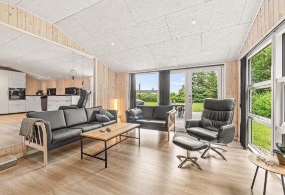 Sommerhuset er lyst indrettet med store vinduer, der lukker masser af naturligt lys ind og skaber en behagelig og indbydende atmosfære. Køkkenet, stuen og spisestuen er samlet i ét åbent område, hvilket gør det muligt for familien at være sammen og deltage i fælles madlavning.