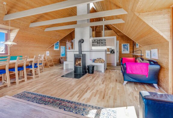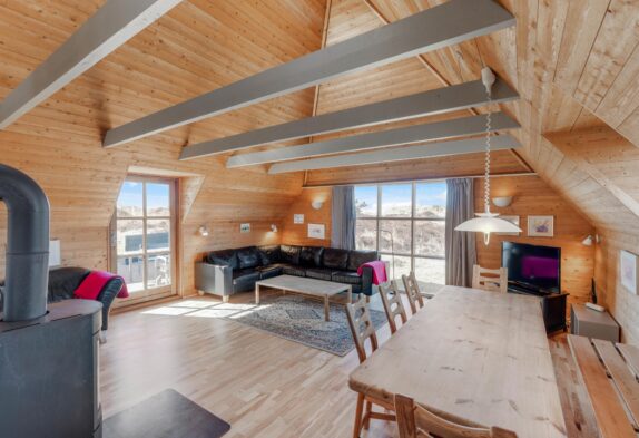 I sommerhuset, der er 250 kvadratmeter stort, kan I samle hele ferieflokken på op til 13 personer til en skøn ferie tæt på stranden og naturen. I stuen kan I samles til hyggelige timer med spil og film, imens sørger brændeovnen for at fuldende feriestemningen med sin knitren og varme. Desuden har I en varmepumpe i feriehuset, der sørger for et godt indeklima.