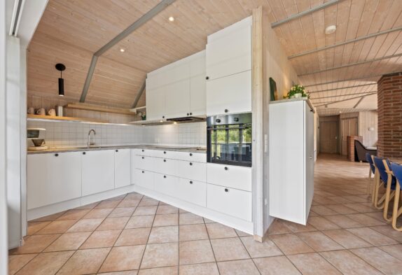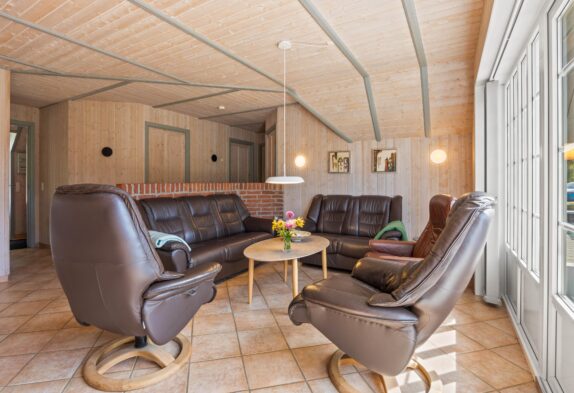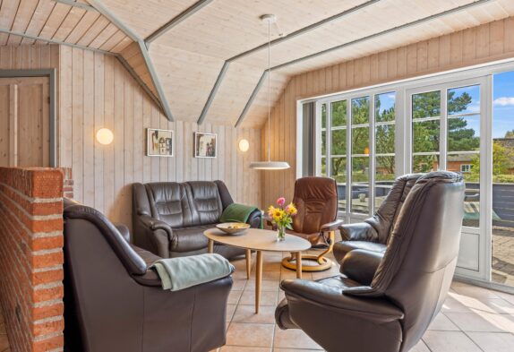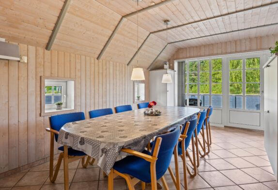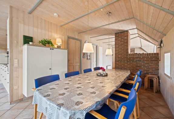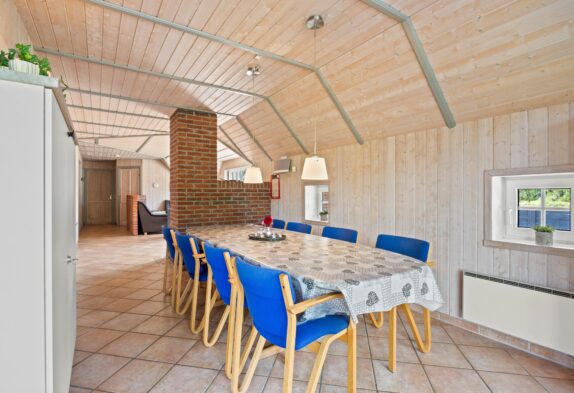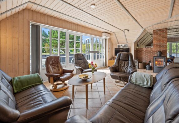Feriehusets hjerterum er det åbne opholdsrum, hvor brændeovnen er centralt placeret. Her fornemmes den klassiske sommerhusstemning med de træbeklædte vægge. I den ene ende finder I det veludstyrede køkken med opvaskemaskine, hvor hobbykokken kan slå sig løs. Modsat er stuen, der indbyder til hyggelige og afslappende stunder – uanset om der er spilleaften eller en god bog på programmet. Tænd op i pejsen for ekstra hygge. Der er parabol fjernsyn, så i kan planlægge hyggelige filmaftener med hele familien.