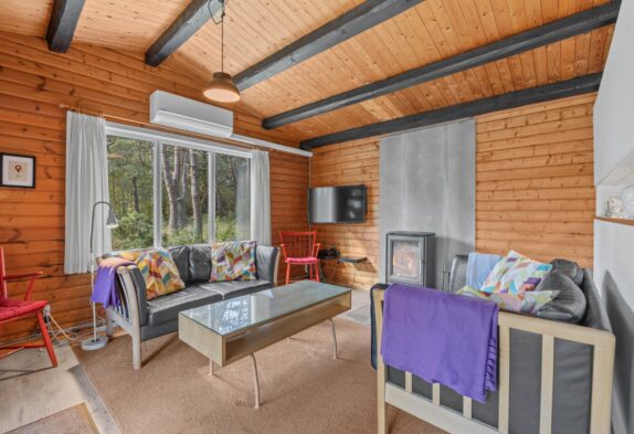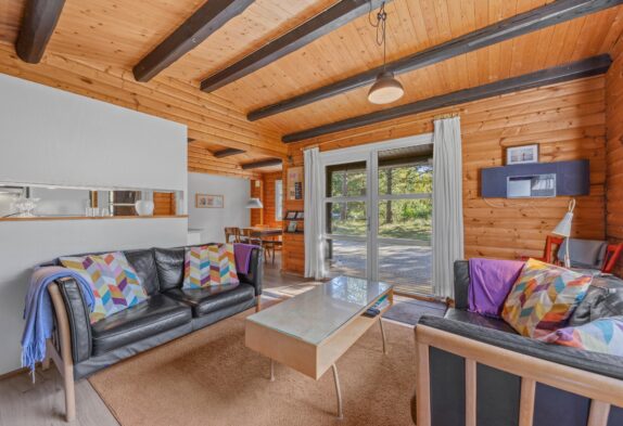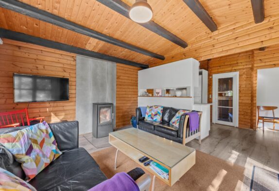 Hjerterummet er stuen, som ligger i åben forbindelse med køkken og spisestue. I stuen knitrer brændeovnen, der spreder varme og hygge. Slå jer ned med en god bog, spil brætspil eller stream film. I feriehuset finder I nemlig en Chromecast, så i kan se lige det i har lyst til, direkte fra telefonen.