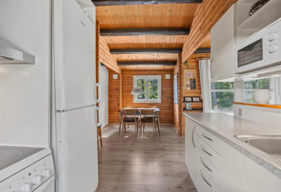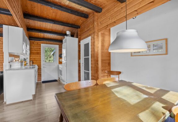 Udover brændeovnen kan I skabe et behageligt indeklima ved at bruge den energibesparende luft-til-luft varmepumpe. Praktisk råder sommerhuset også over vaskemaskine og tørretumbler.