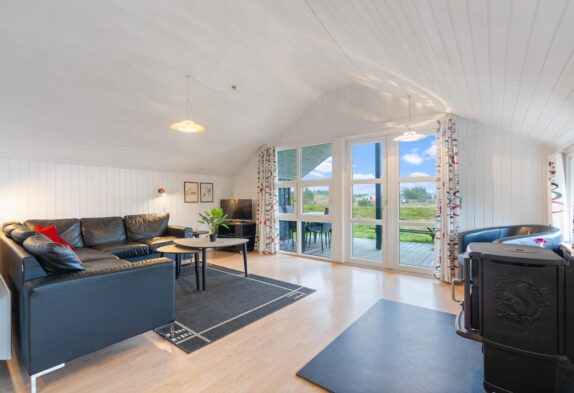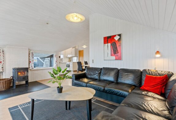 På de køligere årstider skal brændeovnens knitrende flammer nok sørge for både varme og ægte feriestemning. Der er desuden varmepumpe i sommerhuset.