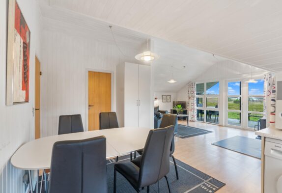 Gennem stuen kommer I til terrassen, som også kan lukkes helt af. I kan altså roligt lade børnene eller hundene lege frit, mens I læner jer tilbage i liggestolene og nyder solens varme stråler. Om aftenen kan I tænde grillen og runde dagen godt af, mens I får dagens sidste solskinstimer med.
