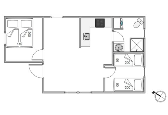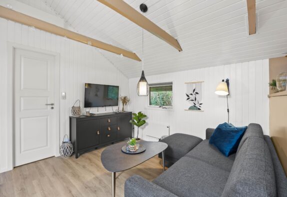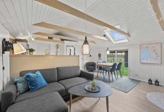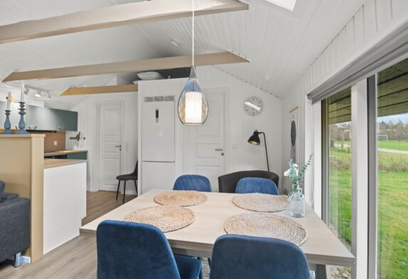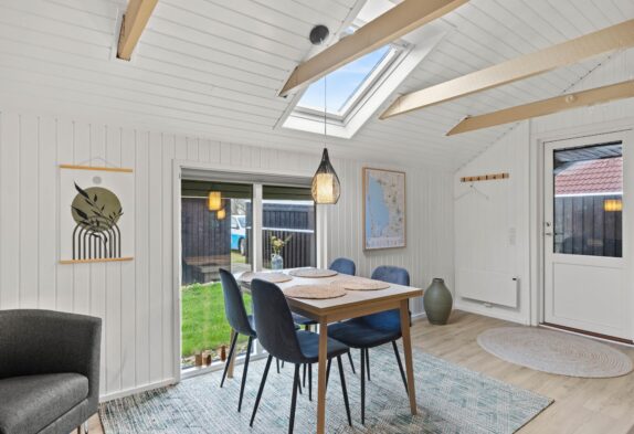 Når I træder ind i sommerhuset, omfavnes I af varmen fra det hyggelige køkkenalrum, der emmer af afslappet feriestemning efter en lang dag i det fri. Køkkenet er designet til samvær og er fuldt udstyret med både opvaskemaskine og vaskemaskine, hvilket gør daglige opgaver nemme og øger komforten under jeres ophold.