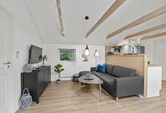 Det lyse og indbydende stueområde, med sit åbne rum, skaber en rummelig atmosfære, der er ideel til afslapning og fælles madlavning efter dagens oplevelser. Badeværelset er funktionelt indrettet med alt, hvad I behøver, hvilket sikrer en afslappet og problemfri ferieoplevelse.