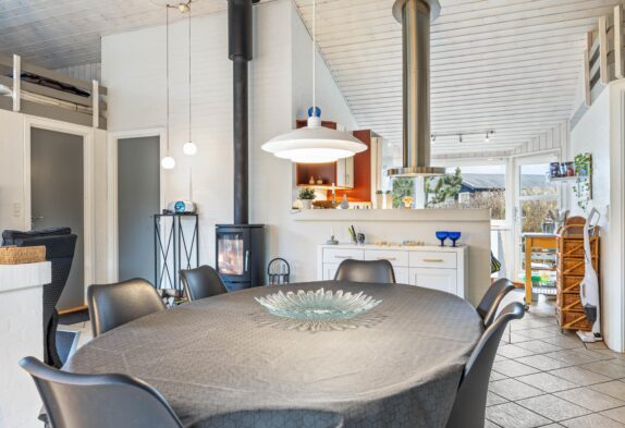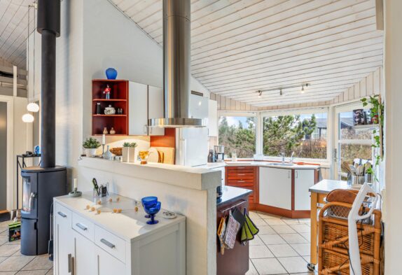 Sommerhusets køkken, ligger i åben forbindelse med alrummet, hvilket der er med til at hele familien kan have en samtale sammen, uanset om I står i køkkenet og laver et lækkert måltid, eller I sidder ved spisebordet og spiller et brætspil sammen.
