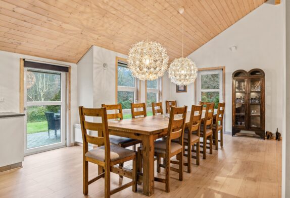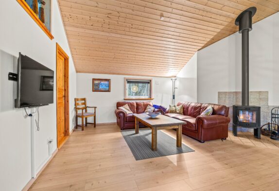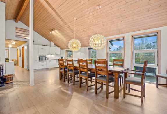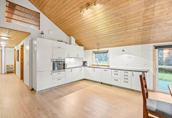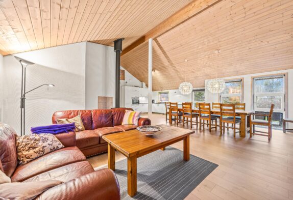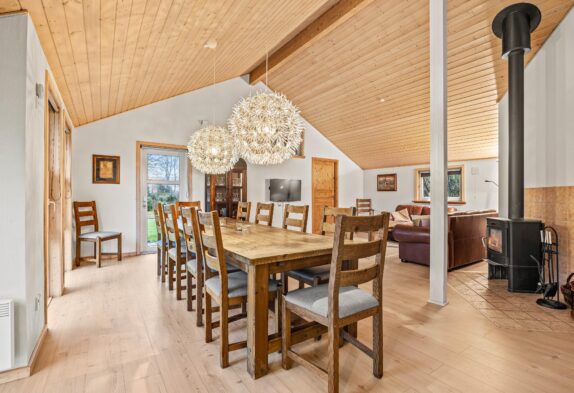 Inde i sommerhuset møder I et indbydende og åbent køkkenalrum, der er perfekt til at samle familie og venner. Her kan I nemt holde samtalen i gang, mens nogle står i køkkenet og tilbereder maden, og andre slapper af i stuen ved brændeovnen, der giver en hyggelig varme.