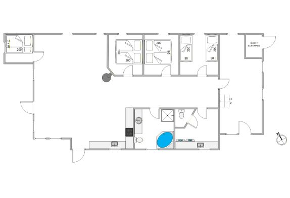 Sommerhuset har fire soveværelser: to med dobbeltsenge, et med to enkeltsenge og det sidste med en dobbeltseng, hvilket gør det oplagt til både familier og vennepar. Badeværelset byder på en tømmespa, og der er også et praktisk gæstetoilet, begge med behagelig gulvvarme. Desuden sørger vaskemaskine og tørretumbler for, at I let kan tage jer af jeres tøj under opholdet.
