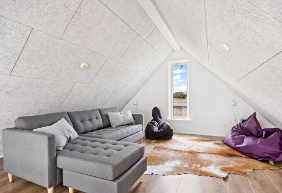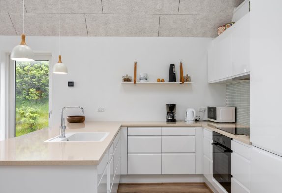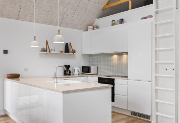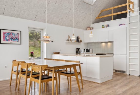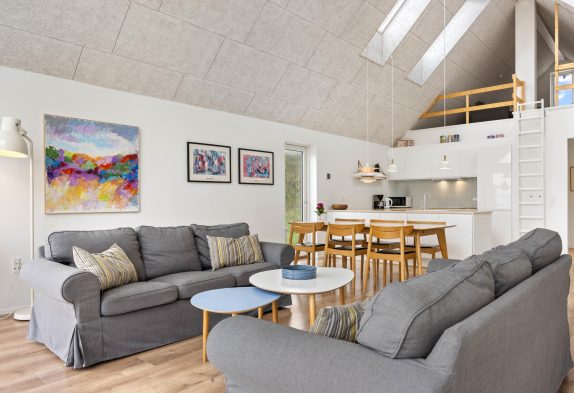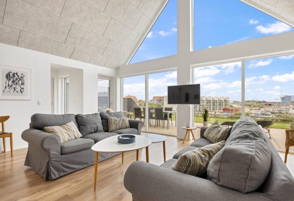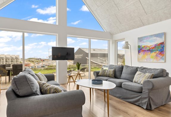 Her kan man bo i et lækkert feriehus midt i Hvide Sande, med en skøn udsigt over havnen og med hele midtbyen inden for få minutters gang. Samtidigt er der ingen trafik lige her, og feriehuset ligger for enden af nogle sammenbyggede huse, så man kan få sig en skøn og rolig ferie. Huset er moderne indrettet med nordiske lyse nuancer. Feriehuset har en luftig atmosfære med højt til loftet og de store vinduespartier, skaber et fantastisk naturligt lys. Der er gulvvarme overalt og det er godt isoleret, så der er lave varmeudgifter. Et perfekt feriehus til en familie med børn eller et par med hund.
