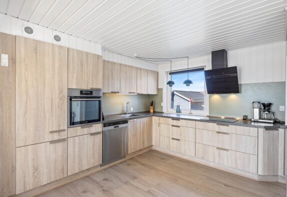Sommerhusets samlingspunkt er køkken-alrummet, hvor der er plads til, at I alle kan samles om aftensmaden eller sætte jer ind i stuen og se en god film. I køkkenet finder I en opvaskemaskine, så I ikke skal tænke på opvasken efter aftensmaden.