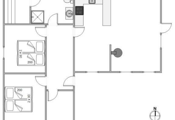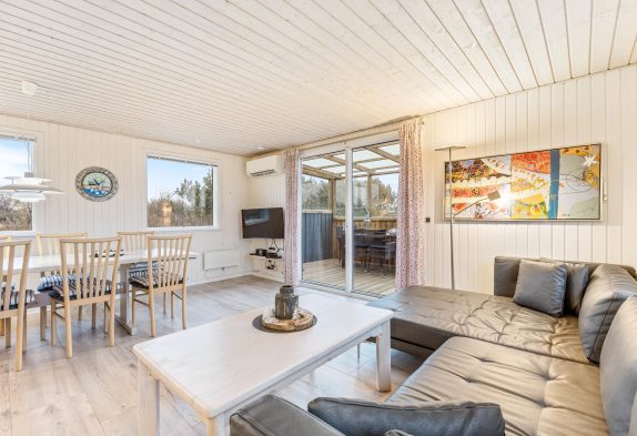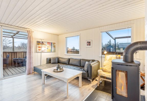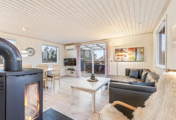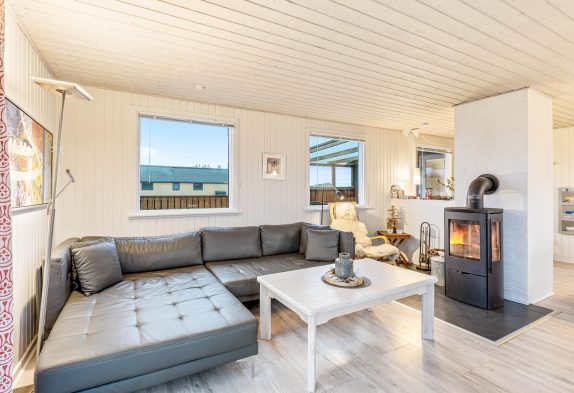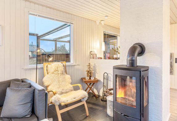 Her føler man sig hjemme straks, man træder ind ad døren. Det fine lysindfald og de hvidmalede, træbeklædte vægge sætter straks feriestemningen i gang. Med ild i brændeovnen kan I her nyde opholdet ved Vesterhavet, selv på stormfulde dage. Stue og køkken er indrettet i åbent plan, så I kan samtale under madlavningen eller trække jer tilbage med en god bog ved varmen fra brændeovnen. Særligt om morgenen, når brændeovnen endnu ikke er tændt, fungerer den energibesparende varmepumpe som en omkostningseffektiv varmekilde.
