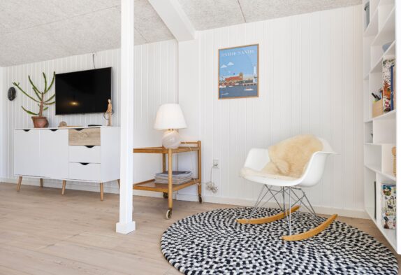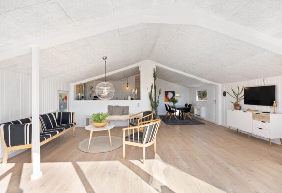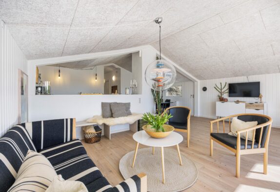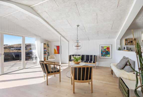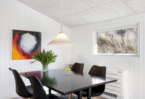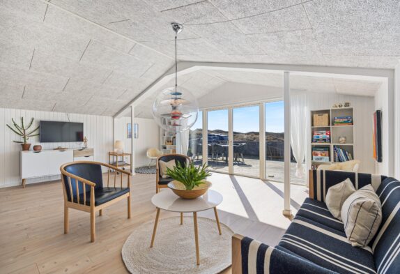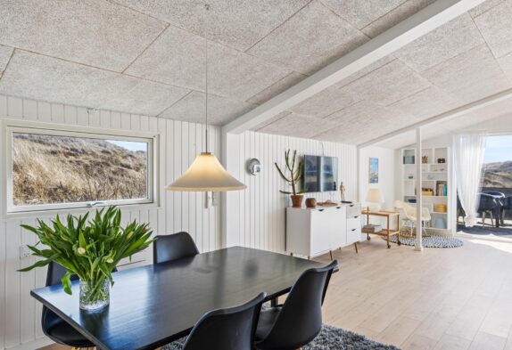 Sommerhuset er indrettet med hyggelige og lyse træpaneler, der skaber en indbydende og dejlig atmosfære. Den rummelige stue er sommerhusets samlingspunkt, hvor I kan nyde den fantastiske udsigt over klitterne eller se en god film på tv’et. Varmepumpen i køkken-alrummet sikrer en behagelig inde temperatur året rundt.