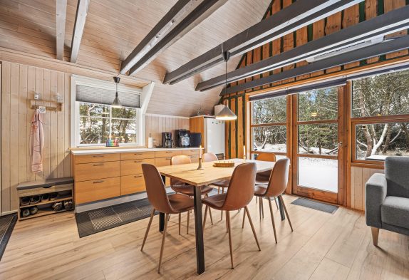 Den åbne spisestue er forbundet med køkkenet, som blev renoveret i 2017, og fungerer som husets hjerte, her vil I finde en praktisk opvaskemaskine, som gør oprydningen let, så I hurtigt kan komme tilbage til hyggen. Både i det store sofahjørne med udsigt til haven og rundt om spisebordet finder I god plads til hele familien, og sammen kan I tilberede spændende feriemiddage, spise god mad og planlægge skønne ferieudflugter.