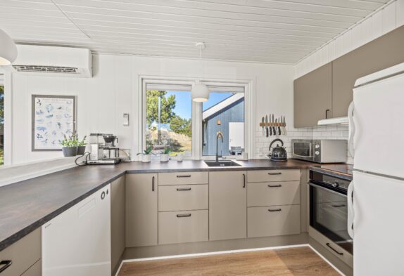Køkkenet er udstyret med en opvaskemaskine og moderne faciliteter, som gør madlavningen nemmere, og vaskemaskinen og tørretumbleren tager sig af tøjvasken, mens varmepumpen sikrer et behageligt indeklima på alle tider af året.