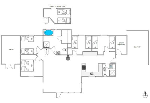 Carporten, der har direkte forbindelse til huset, sørger for, at bilen er beskyttet mod vejrets luner, og i redskabsrummet finder I plads til opbevaring af alt fra cykler til strandudstyr. Dette udemiljø skaber en skøn ramme for aktiviteter og afslapning, som gør ferien i sommerhuset til noget ganske særligt.
