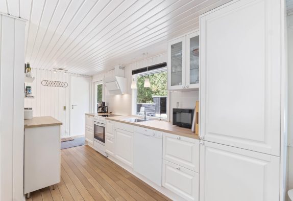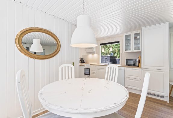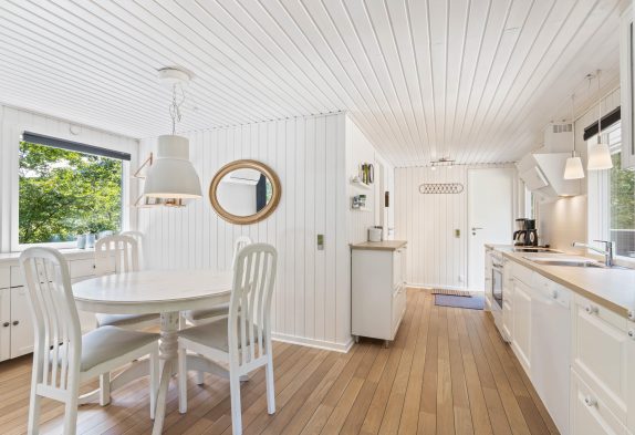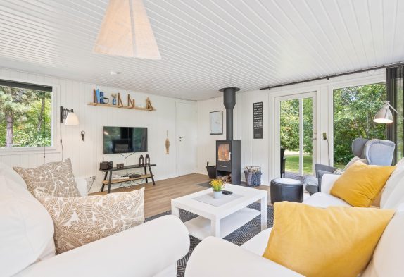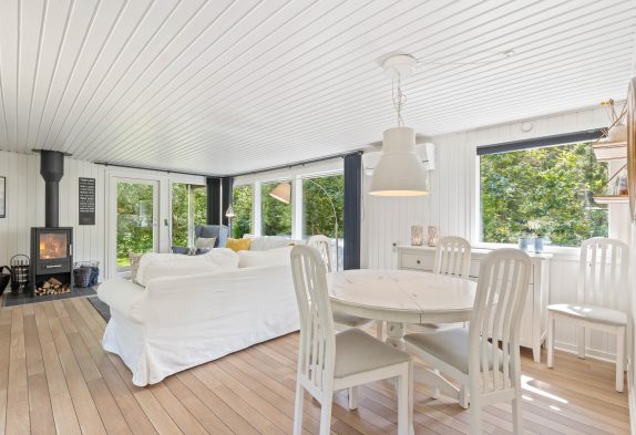 Huset er charmerende og helt lyst indrettet og fremstår indbydende, på trods af de mange træer omkring huset. En skøn kombination! Den flotte brændeovn er populær mange af årets måneder, især efter en lang travetur i området eller ved Vesterhavet. Køkken og spiseafdelingen er tæt forbundet, så man kan nyde tiden og ferien sammen alle sammen.