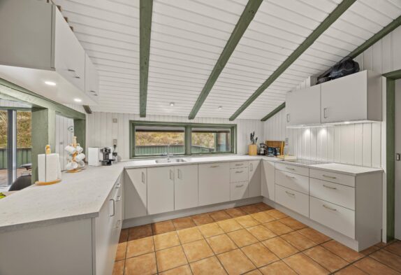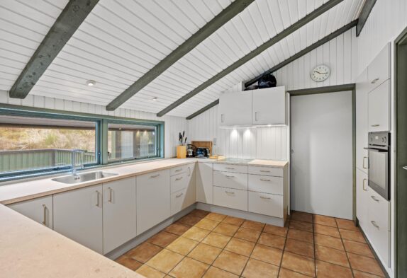 Køkkenet, som er renoveret i 2024, ligger i åben forbindelse med stuen, så samtalerne kan fortsætte, mens maden bliver tilberedt. Det er praktisk indrettet med opvaskemaskine, god bordplads og alt det, I skal bruge til at tilberede dagens måltider – hvad enten det er en nem frokost eller et lækkert aftensmåltid.