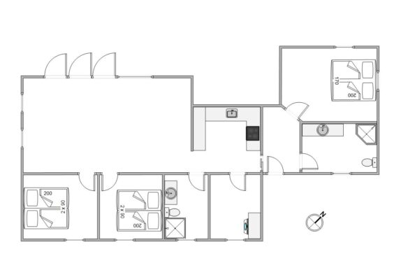 Sommerhuset har 3 soveværelser, hvoraf det ene er indrettet med dobbeltseng, mens de 2 andre har hver 2 enkeltsenge. Dertil kommer 2 badeværelser med gulvvarme, som giver ekstra komfort – særligt på kølige morgener.