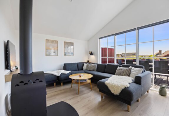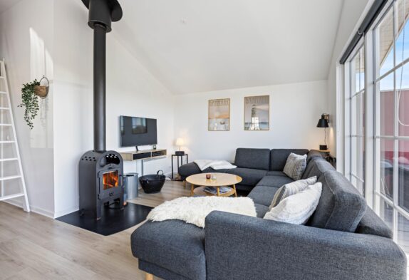 Indendørs byder sommerhuset på en hyggelig og lys indretning. I stuen finder I et hjørnesofaområde, hvor I kan samles foran tv’et eller nyde varmen fra brændeovnen. Her er det oplagt at slappe af efter en lang gåtur eller en udflugt i området. Udover brændeovnen er der også en varmepumpe i sommerhuset, som sørger for en behagelig inde temperatur.