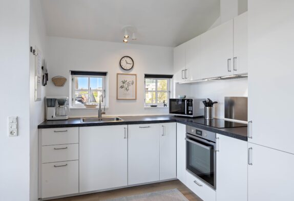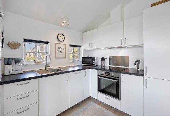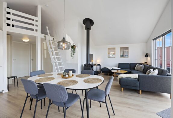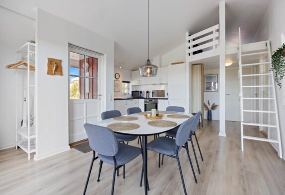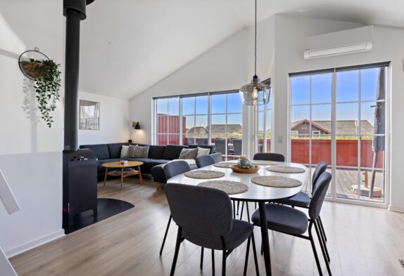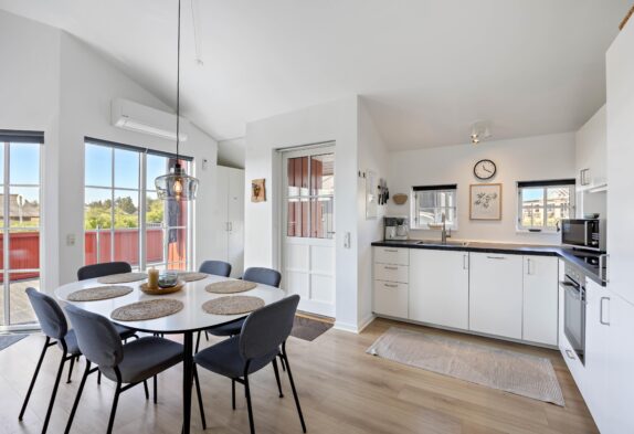 Spiseområdet hænger sammen med stuen og det åbne køkken, som er udstyret med alt, hvad I har brug for til madlavningen i ferien. I skal ikke tænke på opvasken efter madlavningen, da der er en opvaskemaskine i køkkenet.