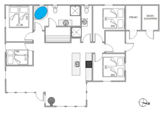Og trænger du til lidt ekstra afslapning og selvforkælelse, er der både en sauna og et spabad – perfekt for både krop og sjæl efter en tur ved stranden. Begge badeværelser har gulvvarme, og de fire værelser er udstyret med komfortable senge, så I er sikret en god nattesøvn. På ét af værelserne findes en køjeseng, 70×190. Uden tvivl et hit blandt familiens mindste.