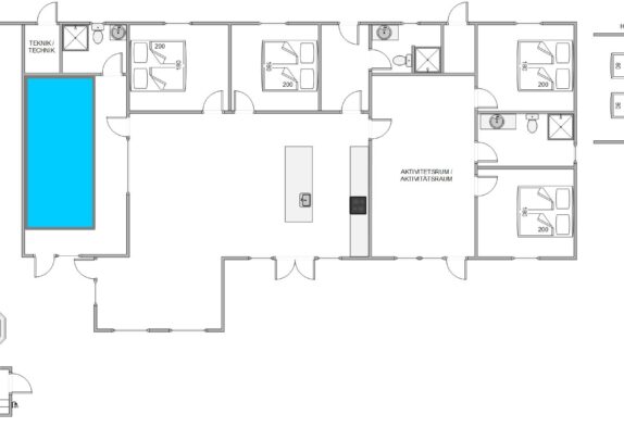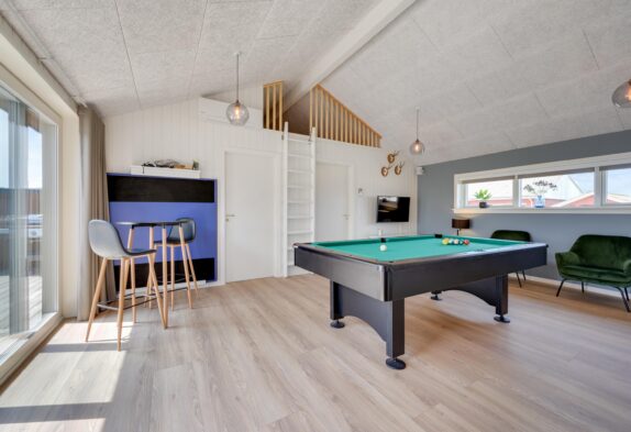To højdepunkter må være swimmingpoolen og det skønne aktivitetsrum, hvor I finder bordtennis og billard. I poolen kan børnene lege, svømme mod strømmen fra svømmetræneren, mens I kan dyste om at finde feriens bedste bordtennisspiller. Uanset vejret og årstiden er her lovet timevis af sjov. I aktivitetsrummet finder I desuden hemsen, hvor 2 af sovepladserne er at finde. Resten er på de 4 soveværelser, der alle er udstyret med komfortable dobbeltsenge, 180×200. Praktisk er her 3 badeværelser, og her finder I alle hverdagens hjælpere såsom opvaskemaskine samt vaskemaskine og tørretumbler.