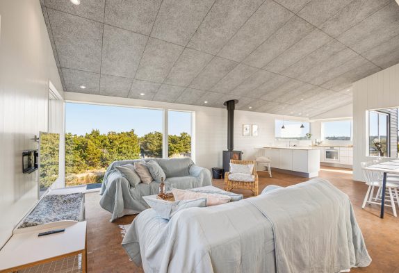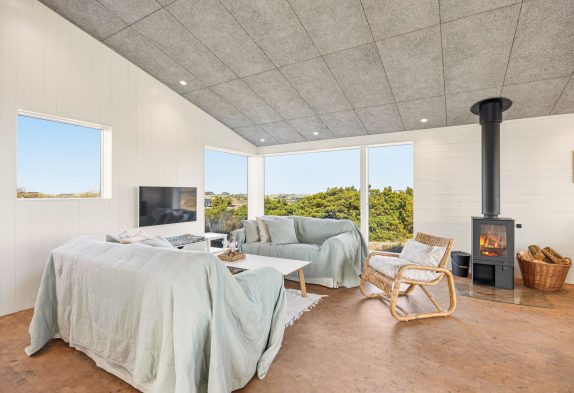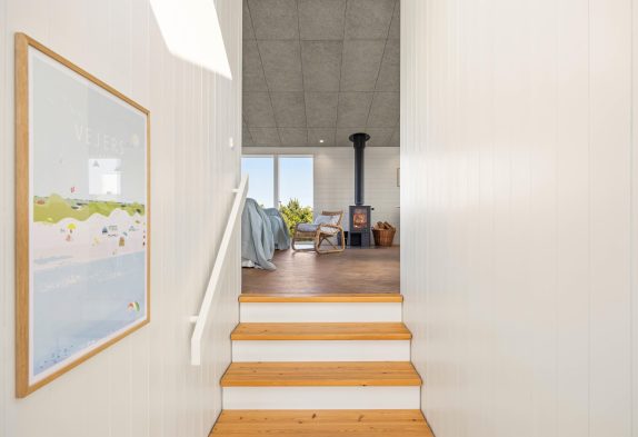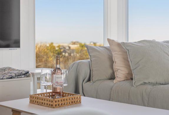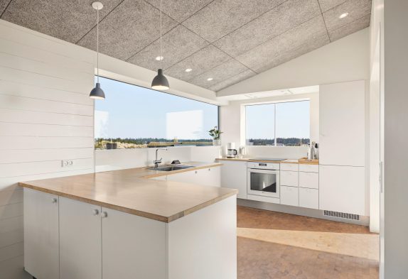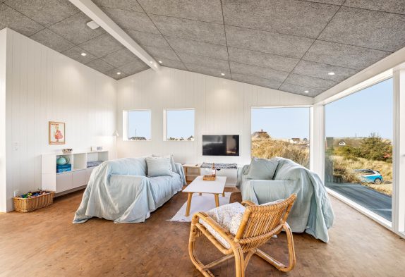 I opholdsrummet samler I jer helt naturligt. Her trækker panoramavinduerne klitternes former tæt på, så I får et smukt panoramablik gennem dagen, mens indretningen holder det moderne og afslappet. Når vinden rusker, tænder I op i brændeovnen og lader varmen brede sig, og på de dage, hvor I bare vil have det nemt, sørger varmepumpen for en behagelig temperatur uden besvær. Om aftenen kan I streame jeres favoritter via Google Chromecast – perfekt til film, musik eller en rolig stund efter en lang dag ude.