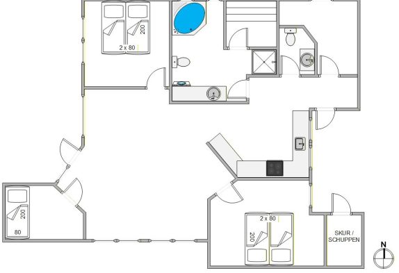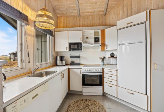 Efter en dag ved vandet kan I forkæle jer selv med sauna og spabad, som er en af de detaljer, der gør dette sommerhus i Bjerregård ekstra attraktivt, når I vil have lidt luksus i ferien. Badeværelset har gulvvarme, og derudover er der et gæstetoilet, så morgenrutinerne glider lettere, når I er flere. Køkkenet og hverdagen bliver også nemmere med opvaskemaskine, og I har desuden både vaskemaskine og tørretumbler. En separat fryser på 30 liter giver plads til is og ekstra ferieforsyninger.