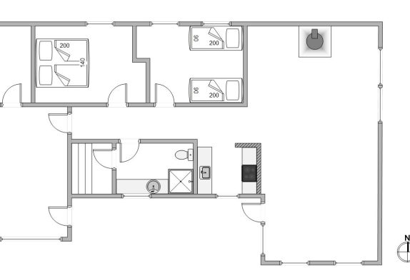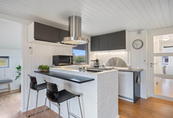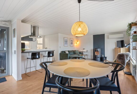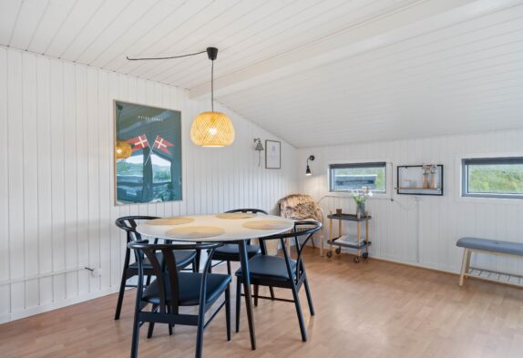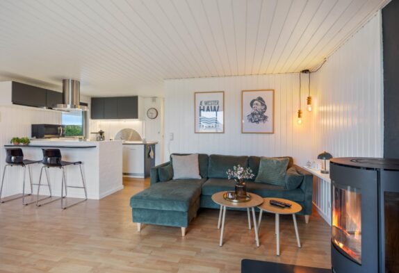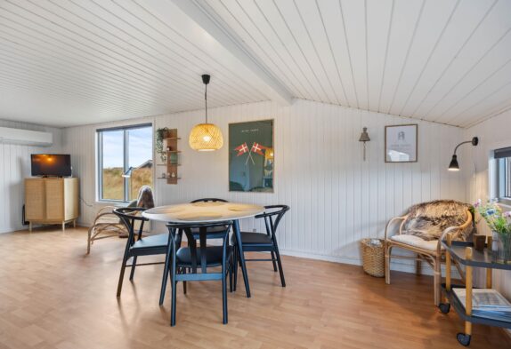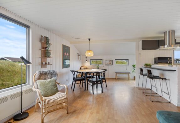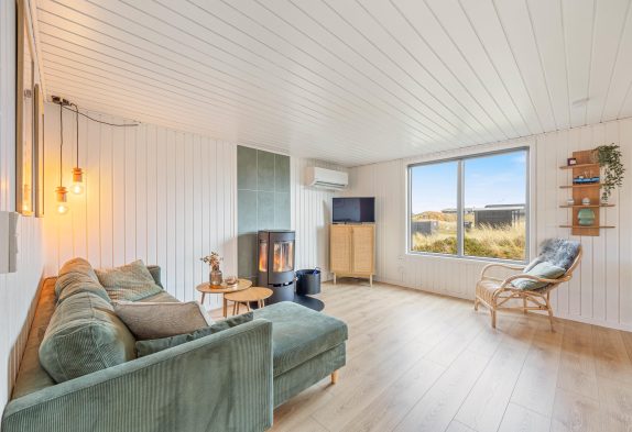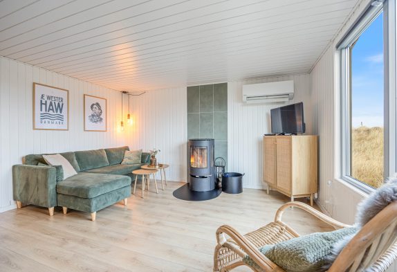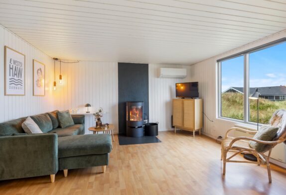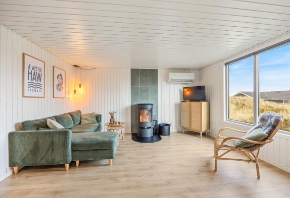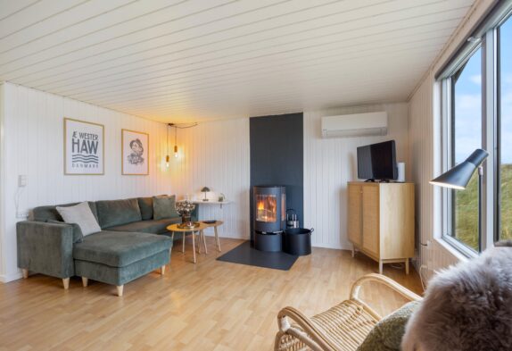 Feriehusets samlingspunkt er stuen, som ligger i åben forbindelse til køkken og spiseplads. I stuen er der en brændeovn, som både spreder varme og en ekstra hyggelig feriestemning på en regnvejrsdag. Sommerhuset har også en udestue, hvorfra I har en skøn udsigt til det naturskønne område. På badeværelset finder I en sauna, som er dejlig afslappende efter en lang gåtur ved det brusende Vesterhav. Her er desuden gulvvarme og vaskemaskine. Til en god nats søvn er der 2 gode soveværelser, hvoraf det ene er indrettet med dobbeltseng. På det andet værelse finder I 2 enkeltsenge.