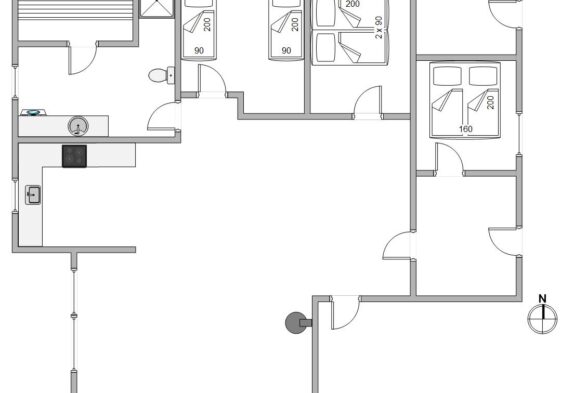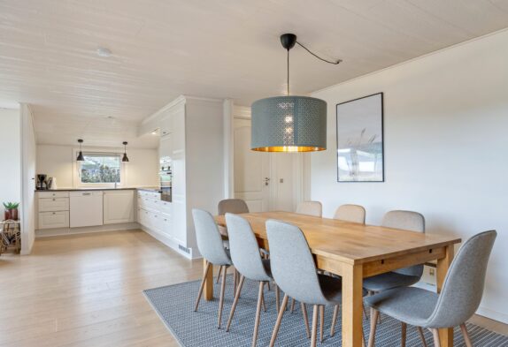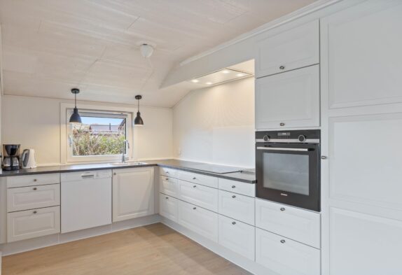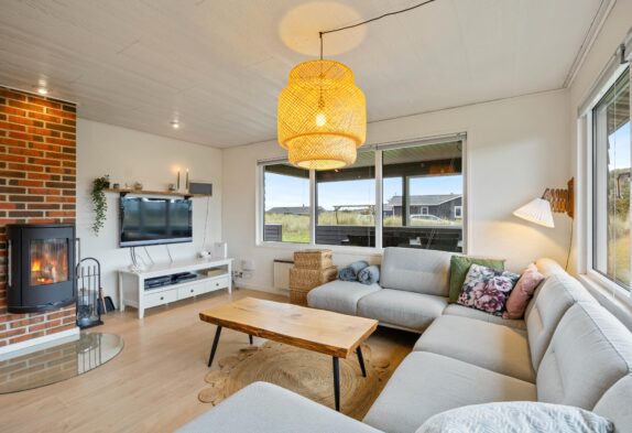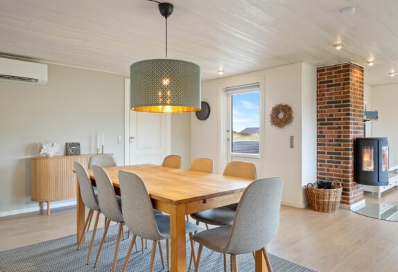 Hjertet i sommerhuset er det praktisk udstyrede køkken, der fremstår lys og hyggelig i landkøkkenstil. Køkkenet er i åben forbindelse med spisestuen og den hyggeligt indrettede opholdsafdeling. Her kan der stresses af med en god bog eller et brætspil – foran den knitrende ild i brændeovnen, der fuldender feriestemningen. Overalt i sommerhuset er der god plads, både i stue, soveværelser og det store badeværelse med bruser samt gulvvarme og adgang til den rummelige sauna. Der er desuden gratis trådløst internet, vaskemaskine og tørretumbler i dette sommerhus. De 6 sovepladser fordeler sig på 3 gode soveværelser, hvoraf det en er indrettet med dobbeltseng. På de andre værelser finder I komfortable enkeltsenge.