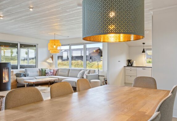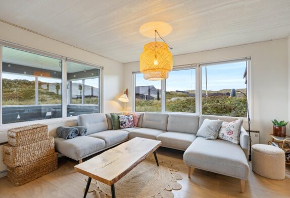 Beliggenheden er fin på en stor naturgrund med gynger til familiens mindste. Den store afskærmede terrasse er møbleret med gode havemøbler, liggestole og grill til de udendørs kulinariske udfoldelser. Her kan man virkelig nyde, at der er højt til himlen i den vestjyske natur. Desuden er terrassen lukket, så hundene kan gå frit. Har I lyst til oplevelser, seværdigheder eller blot en travetur med lidt shopping eller restaurantbesøg byder området på masser af muligheder langs hele den skønne Holmsland Klit mellem Nordsøen og den lidt roligere, idylliske Ringkøbing Fjord. Derudover er det oplagt at besøge den smukke sandstrand ved Vesterhavet, som ligger blot 200 meter fra sommerhuset.