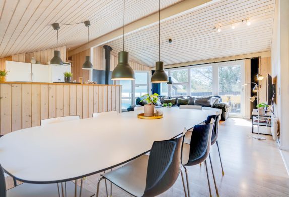 Den store vinduesfront, de høje lofter og trægulvet i stuen skaber en lys og indbydende atmosfære, som gør opholdet ekstra behageligt.