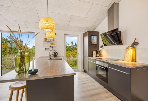 Efter en hyggelig middag, som I tilbereder sammen i det lyse og åbne køkken, kan du hoppe en tur i husets sauna og blive varmet rigtig igennem. I øvrigt helt uden at skabe toiletkø uden for døren, idet huset byder på to badeværelser til de op til 6 feriegæster. Udebruseren på terrassen er perfekt til at skylle sand og salt af kroppen efter en tur i Vesterhavets bølger (kan bruges fra april til november).