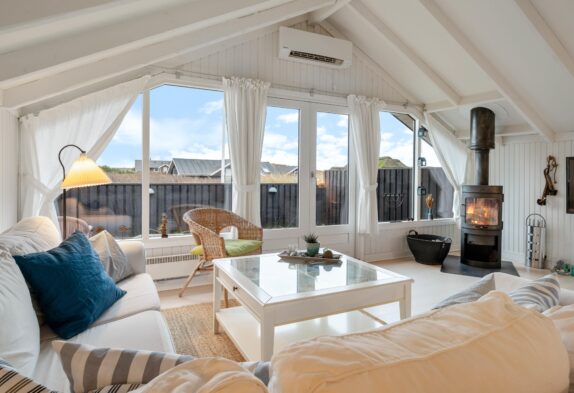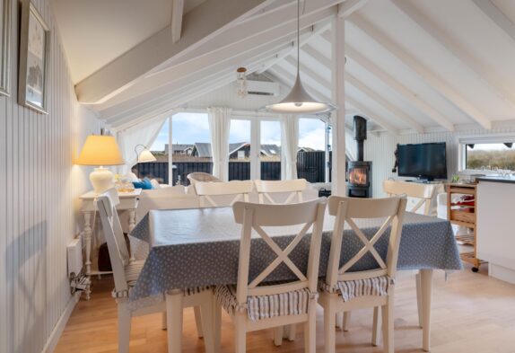De store vinduesfronter i spisestuen lader masser af solstråler slippe ind og lyse rummet op, og brændeovnen sørger for ekstra hygge og feriestemning på de kølige dage, hvor de knitrende flammer giver en behagelig varme, mens regnen trommer på ruden, eller vinden suser udenfor.