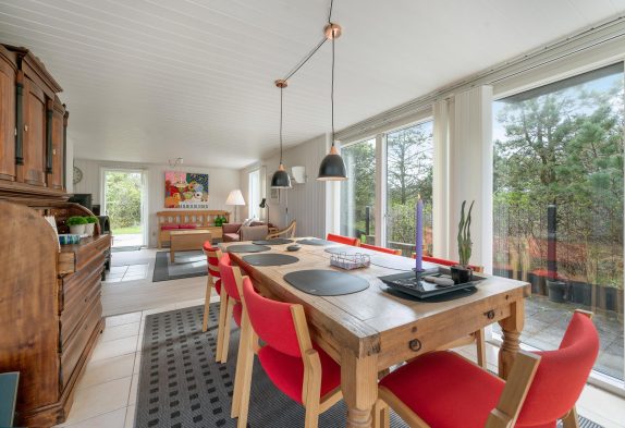 Feriehuset har flere dejlige terrasse, og med udgang både fra stue, køkken og alle soverum ! Start dagen med at træde ud af sengen og med bare fødder ud på den dejlige træterrasse mod øst – hvorefter morgenkaffen kan nydes med solskin og fuglefløjt fra oven.
