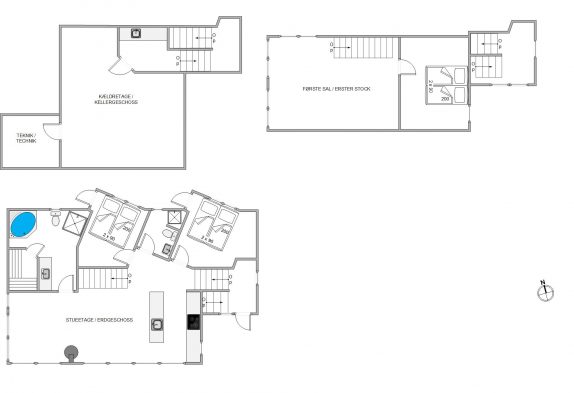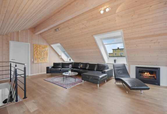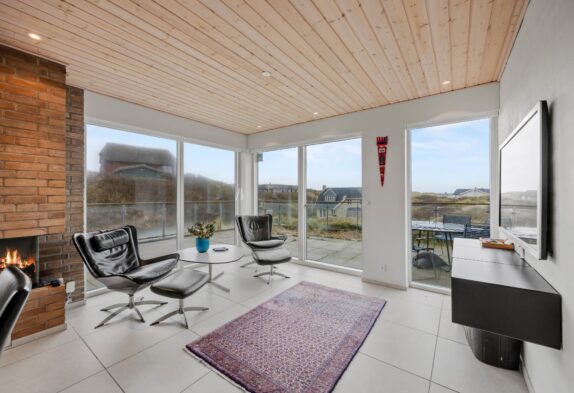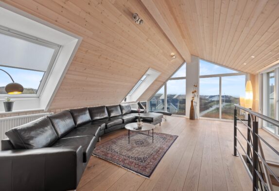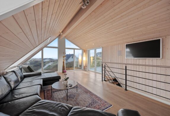 På første sal finder I en hyggelig stue med biopejs, og på den store sofa er der plads til alle – og gennem vinduesfronterne kan I se helt til havet. På det ene af to badeværelser har I også jeres helt egen wellnessoase med sauna og spabad. Hvad mere har man brug for?
