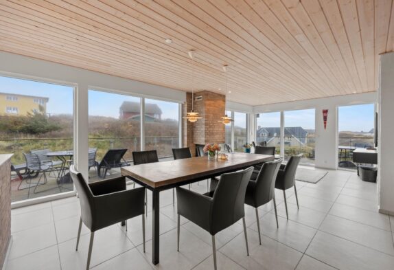 De lyse vægge, gulve og lofter og store vinduespartier sørger for en god og afslappende ferieatmosfære, og gaspejsen i den store spisestue spreder masser af hyggelig stemning på de kolde feriedage.