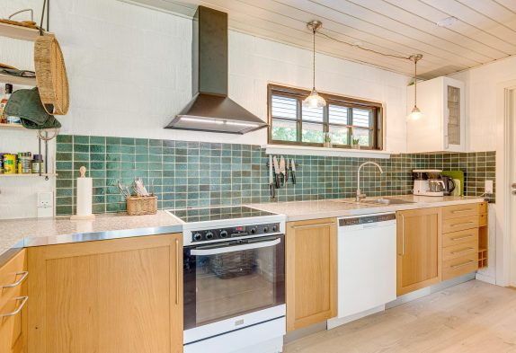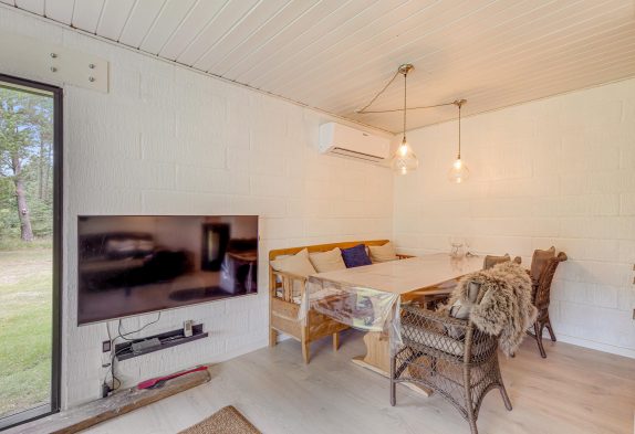 Indenfor i sommerhuset møder I en skøn blanding af klassisk charme og moderne bekvemmeligheder, der udgør det perfekte udgangspunkt for en afslappende ferie. Midtpunktet i huset er et lyst og indbydende køkkenalrum, hvor I kan tilberede måltider og nyde samværet med hinanden. Køkkenet er udstyret med en opvaskemaskine, der gør det let at holde orden. En hyggelig stue med en brændeovn skaber en varm atmosfære til afslappende aftener.