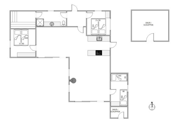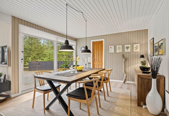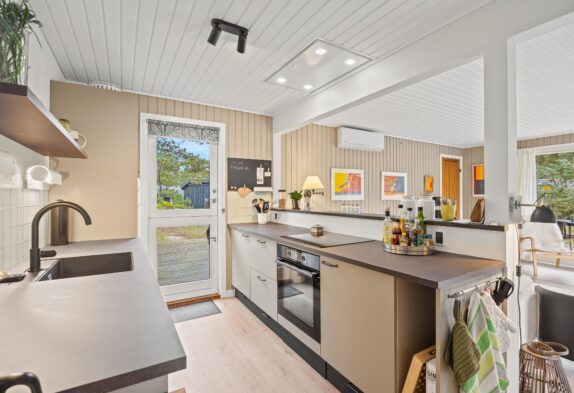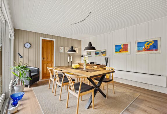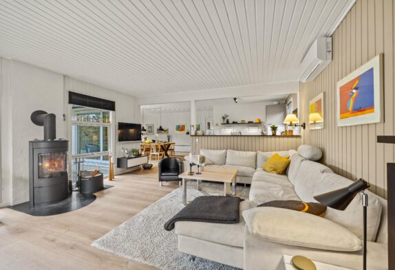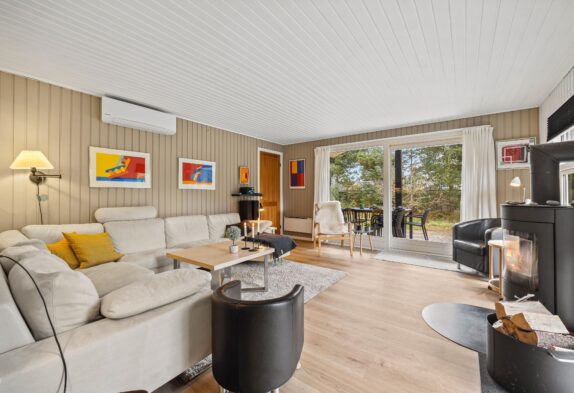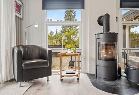 Ikke-ryger huset har god plads til de maks 6 personer og hunden. Det kombinerede stueområde med de mange vinduer er lyst og venligt indrettet, og på den store lædersofa foran brændeovnen kan I læse en god bog eller holde en hyggelig spilaften med familien.