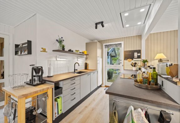 Det veludstyrede køkken ligger i forbindelse med stuen og er rigtig praktisk indrettet med både opvaskemaskine og køleskab med fryser, mens de små detaljer i spisestuen gør middagen ekstra hyggelig.