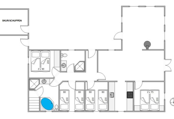 Med plads til 7 personer er huset indrettet med 2 badeværelser, og I behøver altså aldrig at stå i kø til toilettet. På det største badeværelse finder I desuden både en sauna og en spa, så I rigtig kan forkæle jer selv og hinanden.