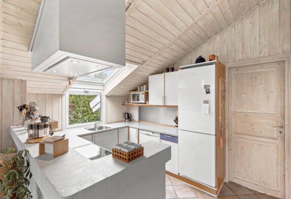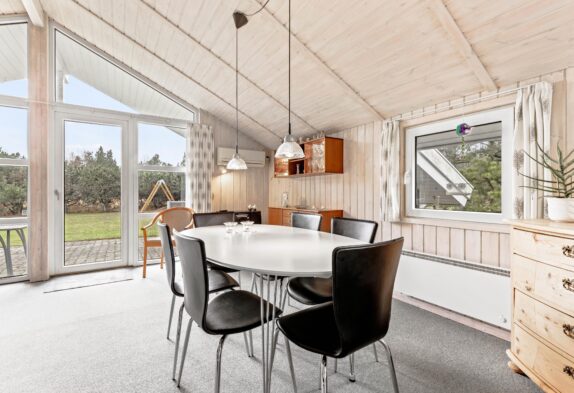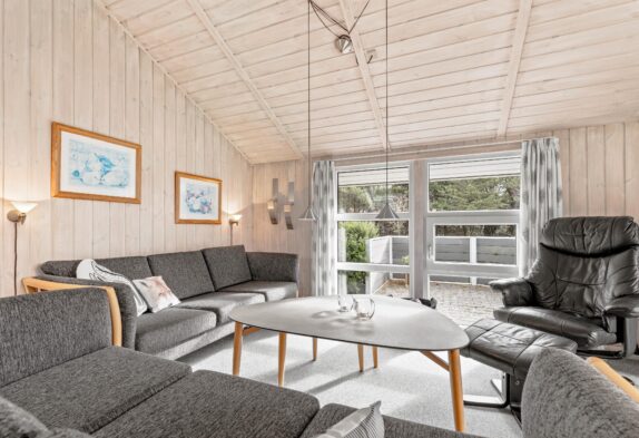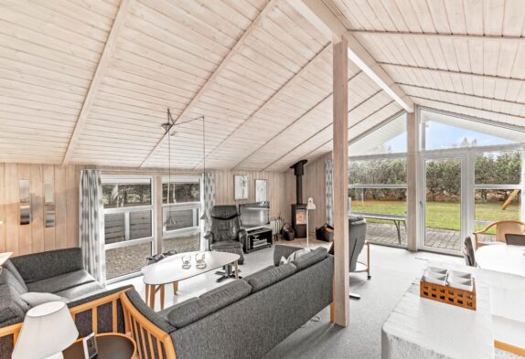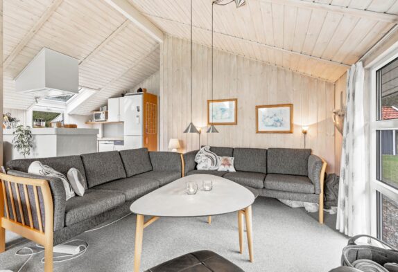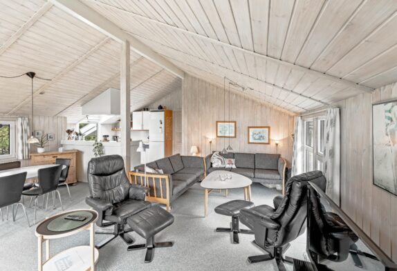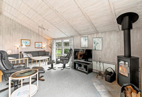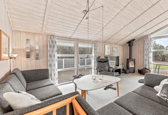 I forbindelse med det åbne køkken finder I den lyse og venligt indrettede spisestue. I det store sofahjørne foran brændeovnen kan hele familien samles om en varm kop kakao på en kølig dag, eller til en god film og en gang popcorn efter en lang dag ude i den friske luft.