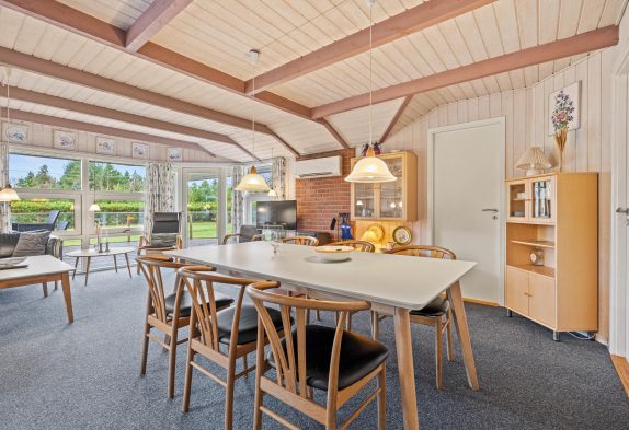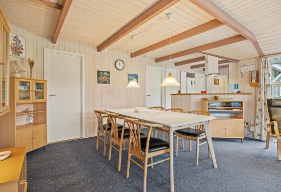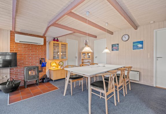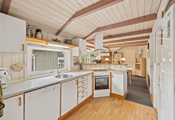 Det fine sommerhus er indrettet i klassisk sommerhusstil, så feriestemningen er lagt helt fra start. I det åbne køkken- og spisestueområde finder I husets hjerte, og her er rammerne sat for en masse hyggelige stunder og gode minder.