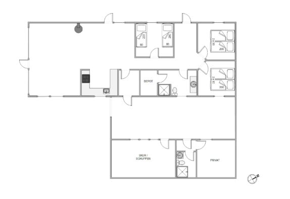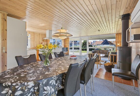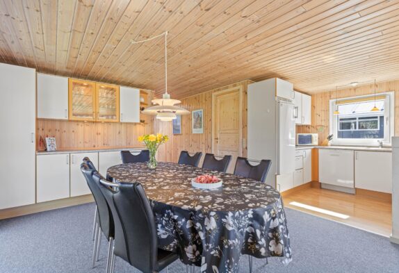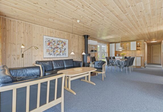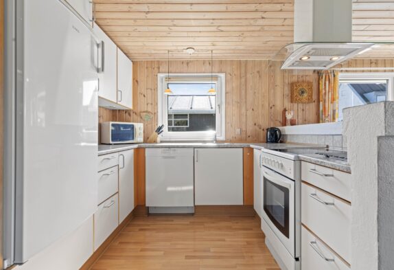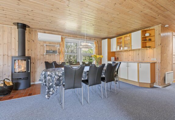 Så snart I træder ind ad døren, vil I blive budt varmt velkommen i de lyse omgivelser, der emmer af klassisk sommerhusstil. Det store kombinerede køkken- og stuerum er sommerhusets hjerte, og her er der lagt op til masser af hyggelige feriestunder. Tilbered lækre måltider i det veludstyrede køkken, og tilbring de sene aftener foran den knitrende brændeovn.