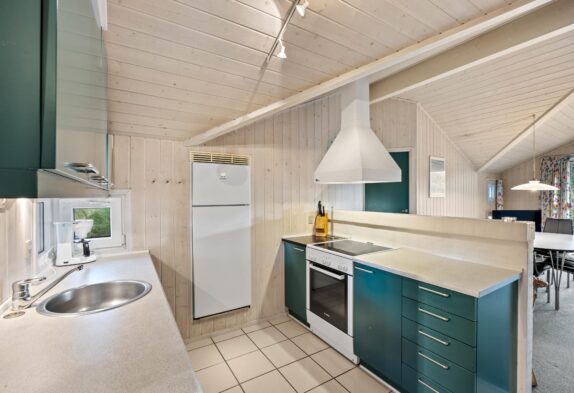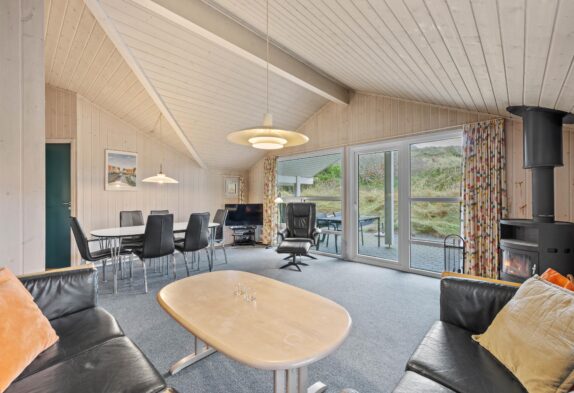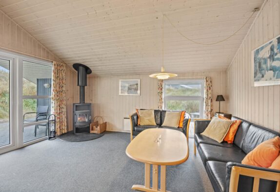 Det skønne feriehus rummer plads til op til 6 personer fordelt på tre fine og velindrettede soveværelser. Både fra soveværelserne såvel som opholdsrummet har I en herlig udsigt ud over det omkringliggende klitlandskab. Nyd udsigten, mens der bliver lavet mad, spillet kort eller slappet af på sofaen med den knitrende brændeovn i baggrunden. Integreret fryser på 40 liter.