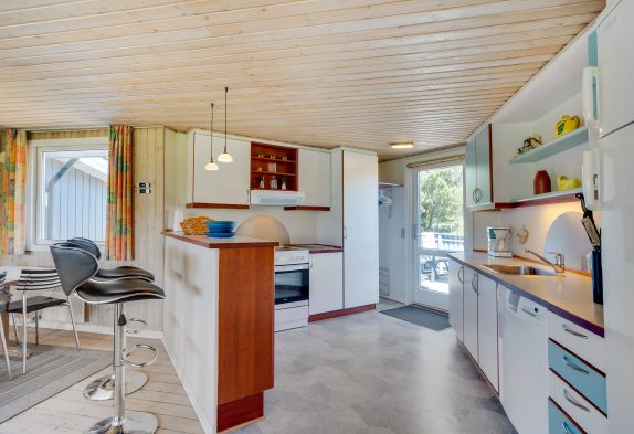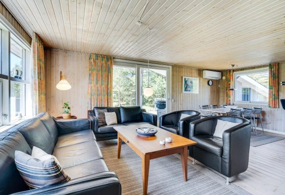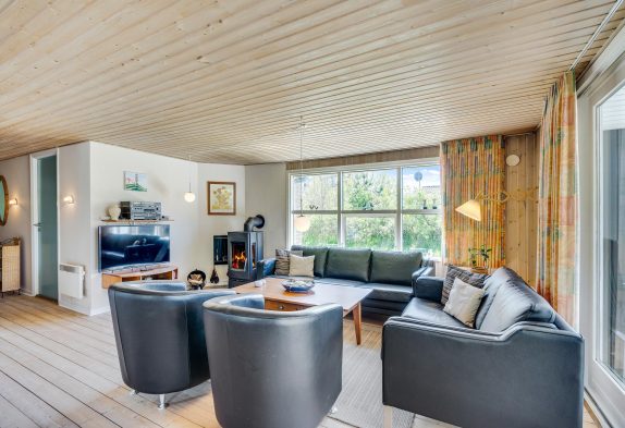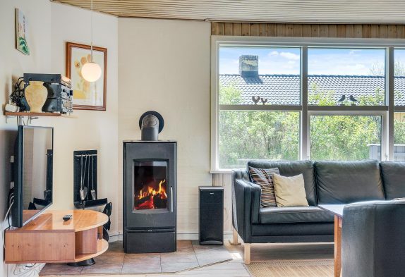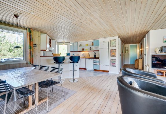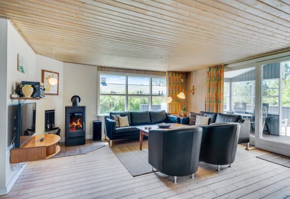 Feriehusets hjerte er helt klart den store stue med åben køkken-alrum. Her kan man tilbringe mange timer sammen og lade dagen gå på hæld foran den knitrende varme brændeovn.