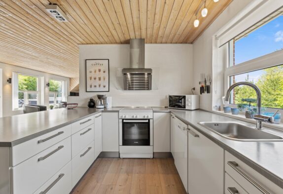 Køkkenet er åbnet op ind til spisestuen, og de store vinduespartier kaster masser af lys ind og gør rummet endnu større og lysere. Køkkenet er veludstyret, og udover opvaskemaskine og mikroovn byder køkkenet på en separat fryser på 80liter til at kunne tage sig af jeres indkøb.